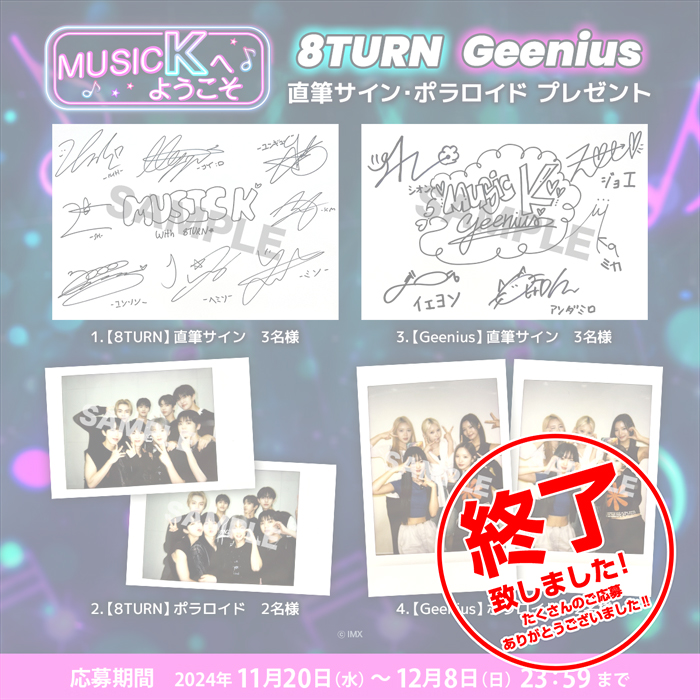 そんな、K-POPファン必見オリジナルコンテンツの独占配信を記念して、エピソード1&2に登場する“8TURN“と“Geenius”の直筆サイン・ポラロイドを抽選で計10名様へプレゼント🎉